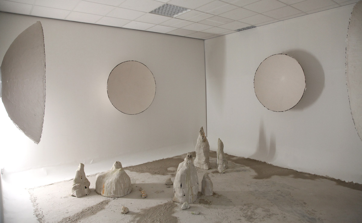 The six sound mirrors placed in a circle create a whispering aural flux where subtle sounds of decaying rocks evoke lost soundscapes, caves of an old civilization, while creating a spatiality specific to viewer/listener interaction. Archeological relics triggering reflections, and the creation of a participatory zone.